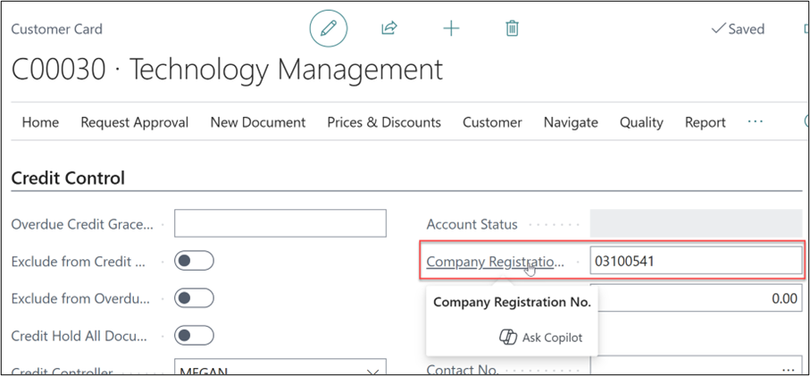 Next, within the Customer Card scroll down to the Credit Control FastTab, here we can see the Company Registration No. field. This field must be populated with the Companies House Registration Number of the customer record.