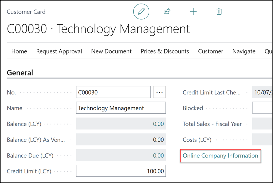 Once populated, the Online Company Information option can be selected within the General FastTab. If the Company Registration No. field is left blank this field will simply redirect you to the home page of the Companies House website, if populated you will be taken to the Companies House page relevant for the Customer Card.