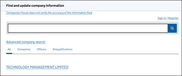 In this example, as the Company Registration No. field is populated, I have been automatically redirected to the Companies House page relevant to, in this case, Technology Management.